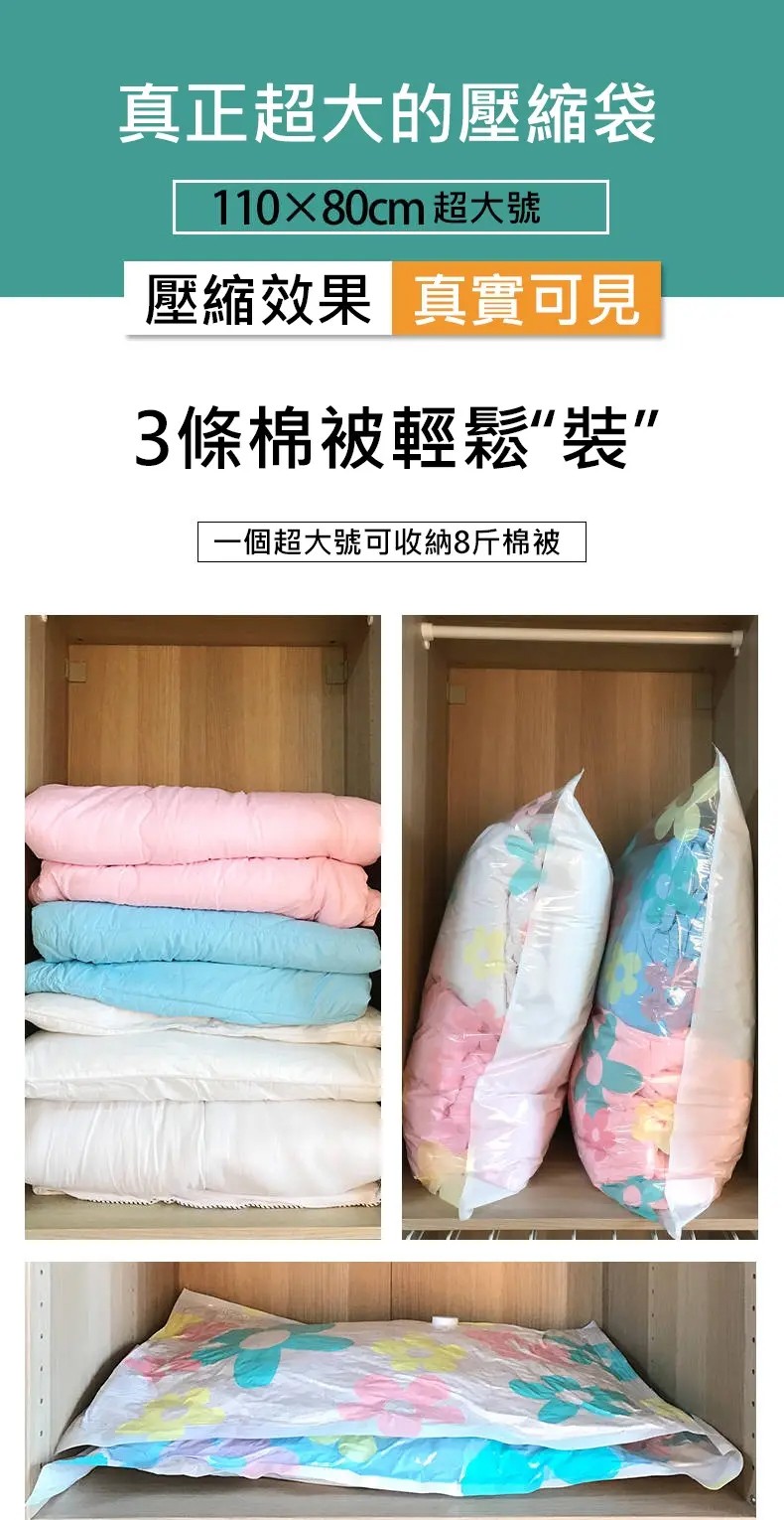 半小時前【居家神器】被子衣物整理真空壓縮收納袋+配電動氣壓手泵 - 特惠3入組,共33件套+電動抽氣泵*3 NT$1598